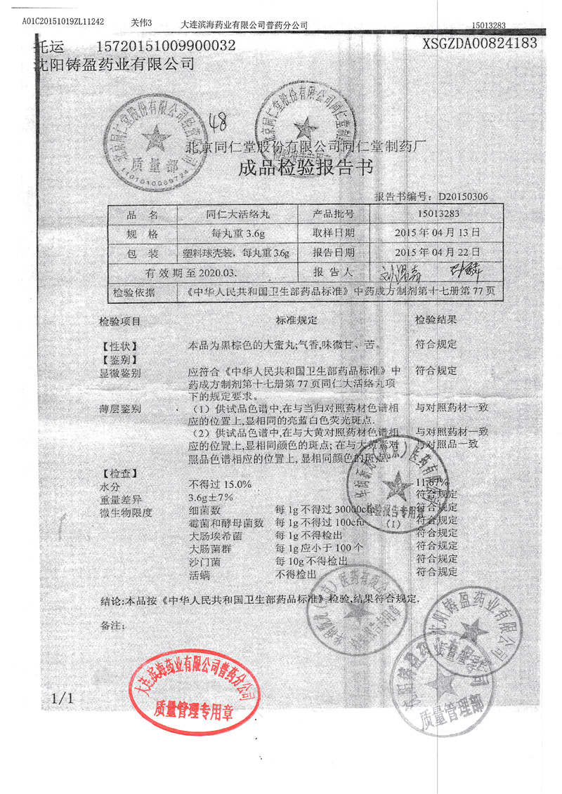 产    地:北京同仁堂股份有限公司同仁堂制药厂